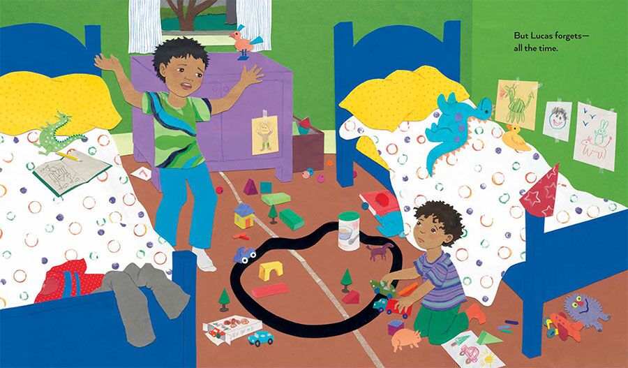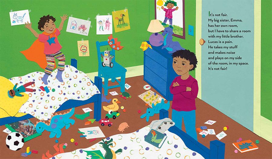 It’s just not fair! Alex’s big sister has her own room, but Alex has to share a room with their little brother, Lucas, who makes noise, plays with Alex’s toys, and takes over both sides of their room. One day, when Lucas breaks Alex’s favorite dragon, spills all the crayons, and throws puzzle pieces into the air, Alex has had enough!