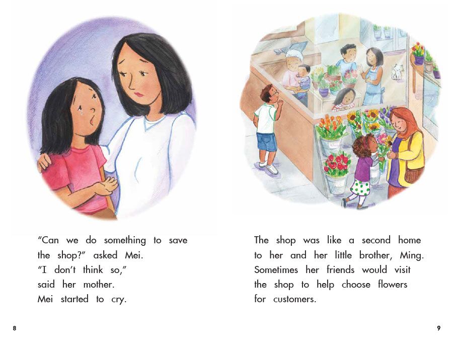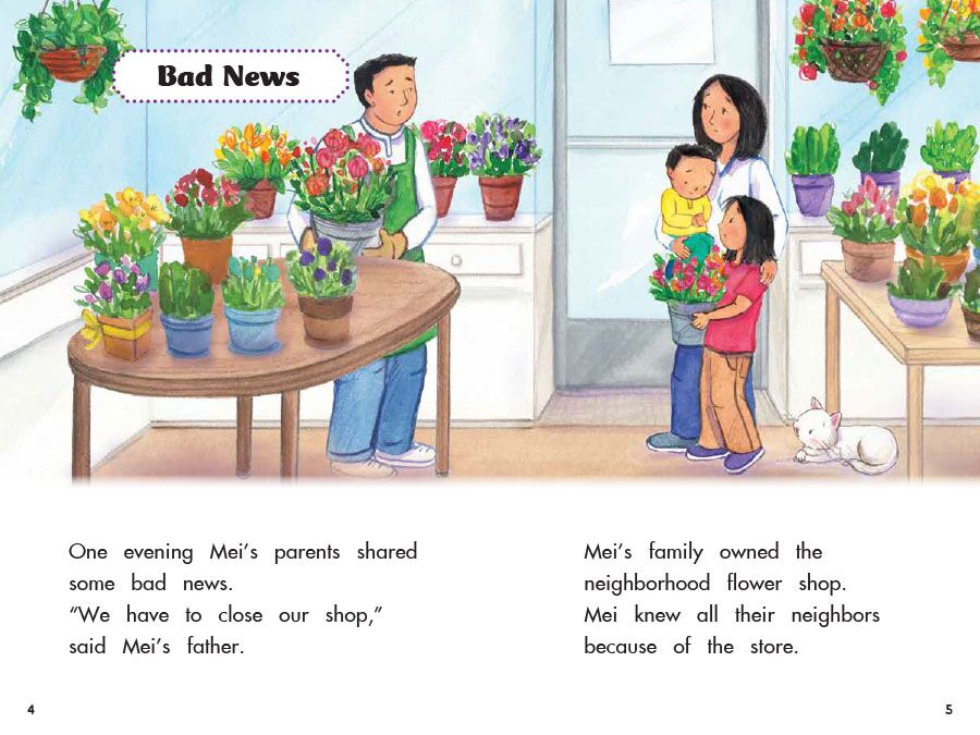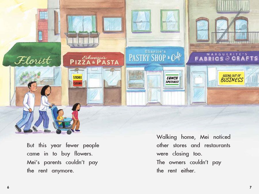 In this story, Mei is saddened to learn that her parents must close their flower shop due to the rising cost of rent. It doesn’t seem fair to Mei. Her family worked so hard every day at the shop, and for what? With the help of her friends, Mei learns just how much their little flower shop meant to everyone in the neighborhood.