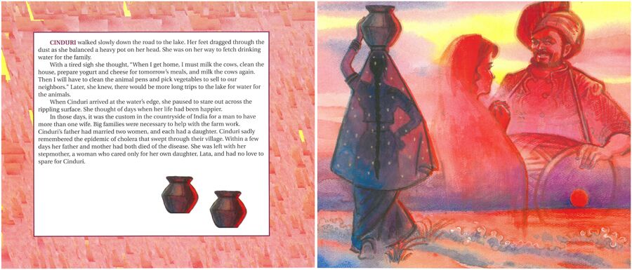 Cinduri has a lot of work to do. Every day she walks to the lake to fetch drinking water, milks the cow, cleans the house, prepares the meals, cleans the animal pens, and sells vegetables. Her stepmother and stepsister, however, don’t do any of the work. They just order Cinduri about and give her a bowl of rice and a few leftovers to eat.