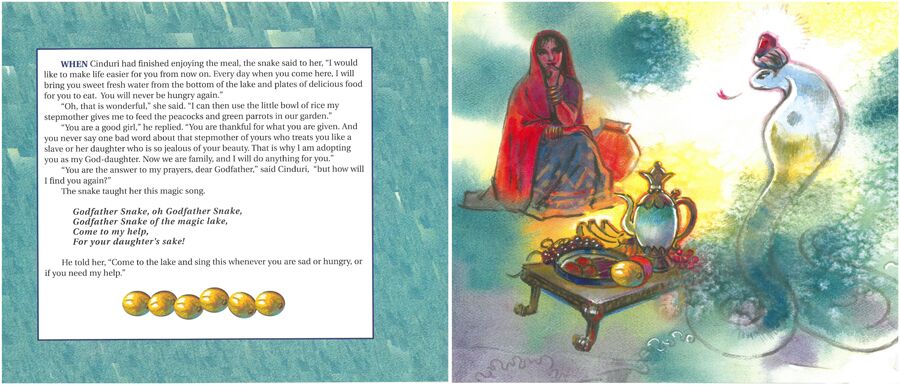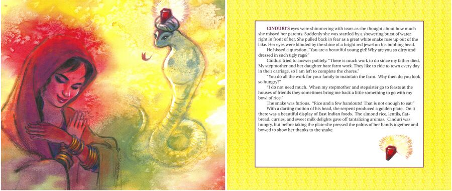 The lake, however, is full of magic. When Godfather Snake hears of Cinduri’s troubles, he vows to make her life easier. And when the Prince comes to visit the village during the annual Navaratri Festival, Godfather Snake makes it possible for her to go, dressed in the most beautiful gold-threaded sari and sparkling diamond anklets. It is there that she wins the heart of the Prince.
