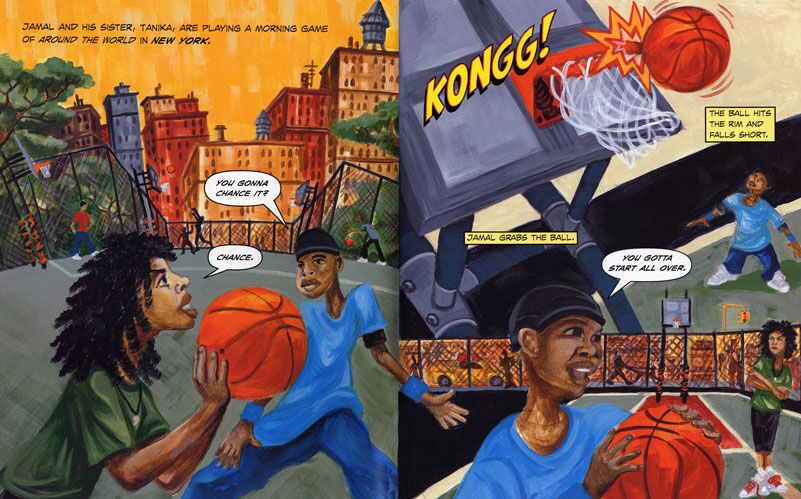 A fantastic journey around the world is about to begin. Starting in downtown New York and traveling to Australia, China, Turkey, Serbia, Nigeria, France, Brazil, Canada, Puerto Rico, and back to New York again, kids play their hearts out in a grueling, winner-take-all, pick-up basketball game. Full court passes in a gym in Shanghai are effortlessly picked off in Istanbul with a turn of the page. Thwack! Readers will challenge themselves to keep pace with these young players while taking in the sights of the Eiffel Tower and other landmarks that frame the action in each city.