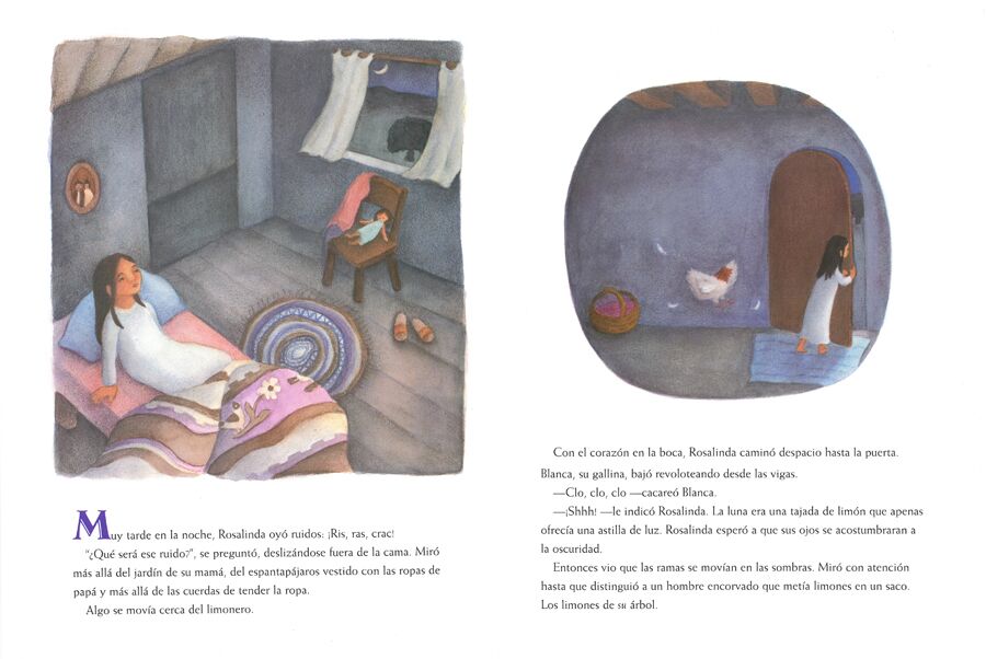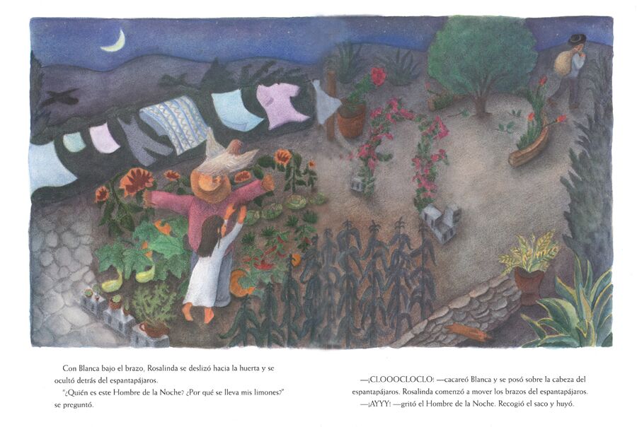 When she and her pet hen, Blanca, investigate, they see a man leaving with a large sack-full of fruit from Rosalinda’s beloved lemon tree.