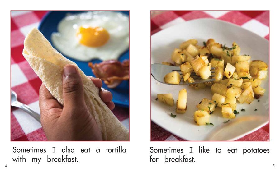 A boy likes to eat many different foods for breakfast-from eggs to noodles.