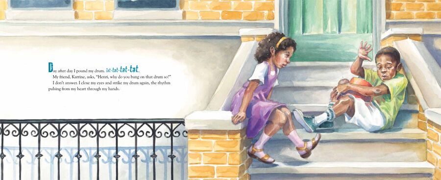 Then the small boat overturns, and Henri is placed on top of the boat as his parents drift further out at sea. Overcome with grief, Henri retreats into himself and is no longer able to speak once he reaches land. Encouraged by his uncle and neighbor, Henri takes a bucket and plays on it like a drum. The drumming becomes a link to his past and a conduit for his emotions. Slowly, through his drumming and the kindness of his uncle and friend, Henri learns to navigate this new and foreign world without his parents.