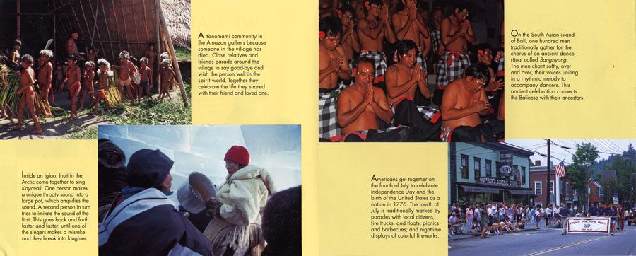 Every culture has its own special traditions and reasons for celebrating. People in the Australian Outback walk on a dream journey, connecting with their past. In Bali, dancers perform a graceful Legong dance, telling an ancient story. And in the United States we watch fireworks, marking the birth of our country.