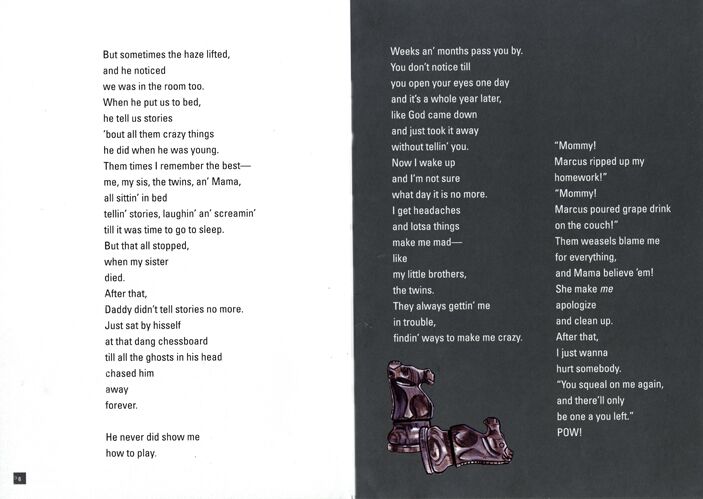 In Marcus’s world, battles are fought everyday-on the street, at home, and in school. Angered by his sister’s death and his father’s absence, and pushed to the brink by a bullying classmate, Marcus fights back with his fists.