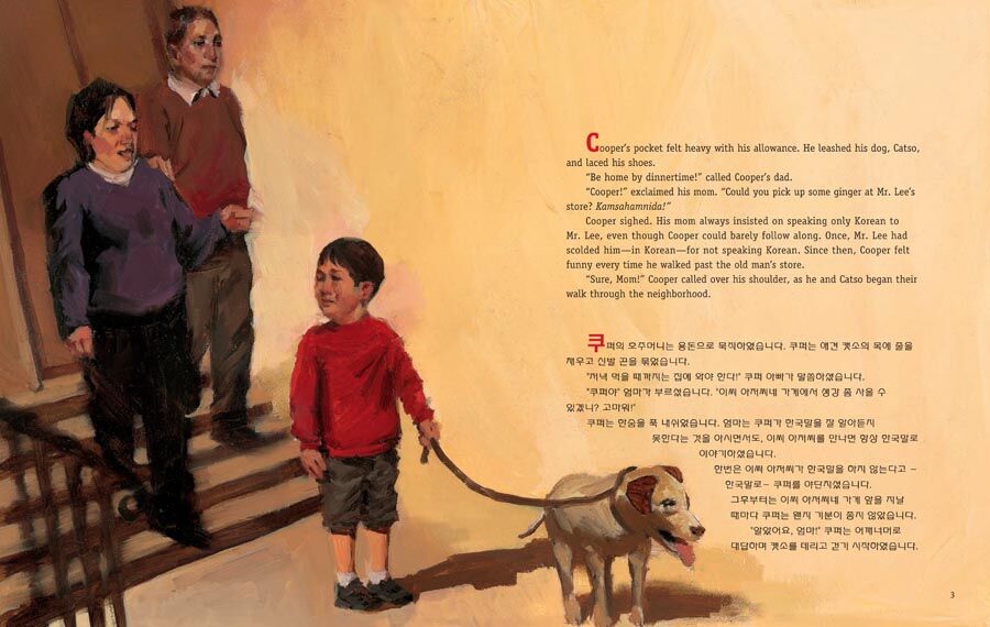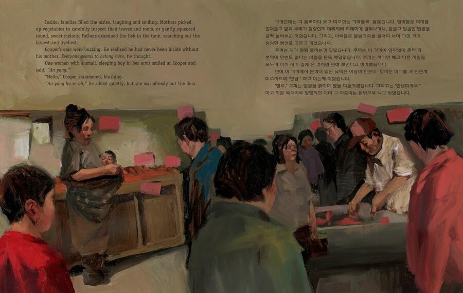 One moment in Mr. Lee’s store changes everything for Cooper. Before long he realizes that the question of who we are is never simple-whether you talk about it in English or Korean. Kim Cogan’s richly hued oil paintings perfectly complement this story of identity and intergenerational friendship, and author Sun Yung Shin brings her characters to life with tender, vivid prose.