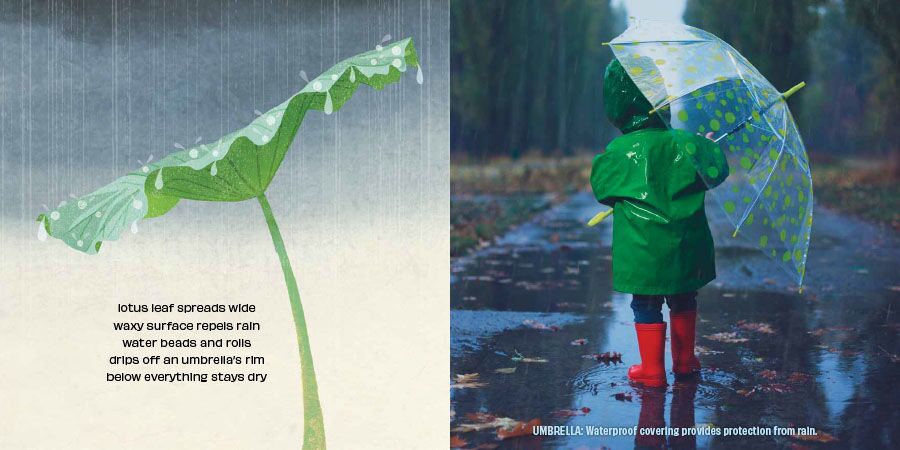 Illustrations of plants and animals and tanka poetry are paired with photographs of innovative inventions and designs found around the world to present captivating examples of nature-inspired design. A lotus leaf inspires the invention of the umbrella. A cat’s eyes inspire the development of safety road reflectors. Discover how mimicking behaviors and strategies in nature lead inventors and designers to develop amazing new products, processes, and technologies that improve our lives and environment.