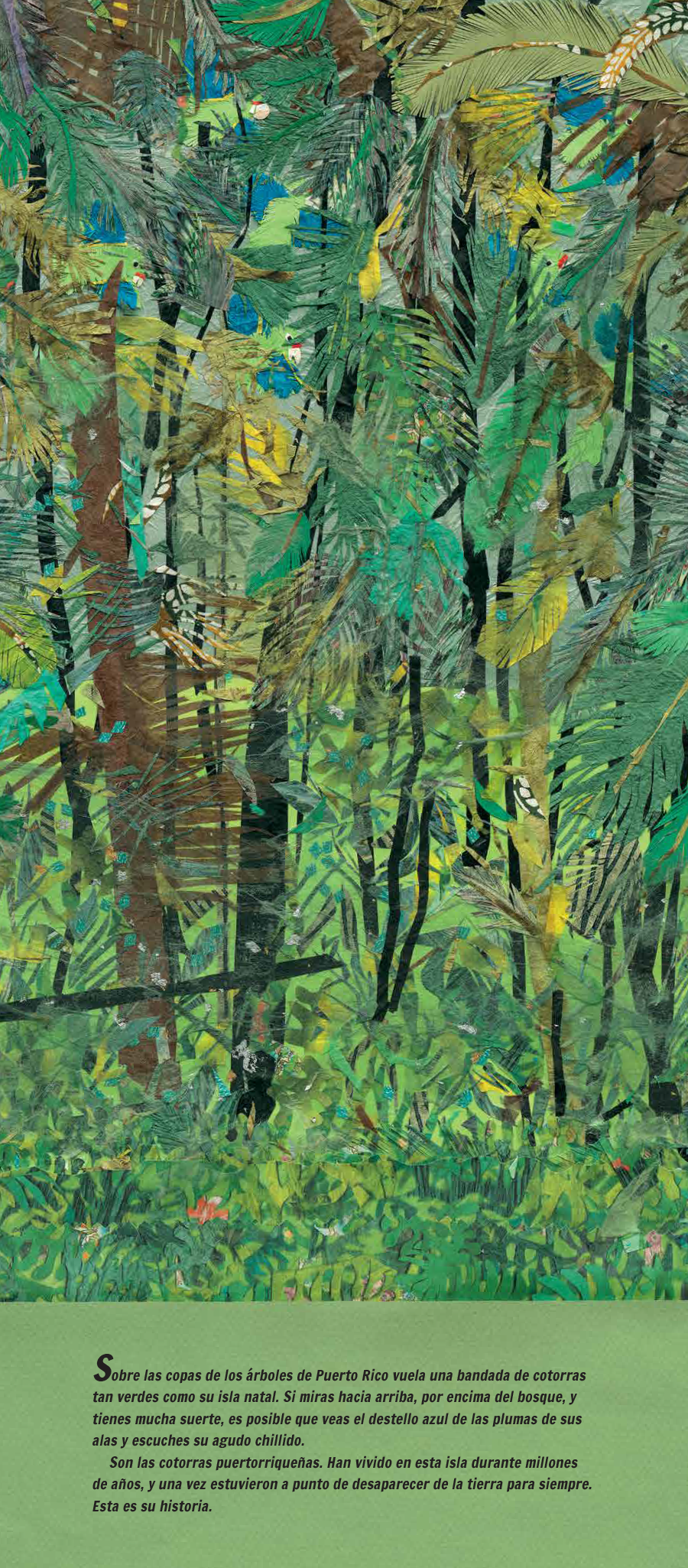 Durante siglos, las bellas y escandalosas cotorras puertorriqueñas y los pobladores de la isla de Puerto Rico buscaron alimentos, sobrevivieron a los huracanes, cuidaron su descendencia y protegieron sus casas. Pero las cosas comenzaron a cambiar y, con el tiempo, los árboles donde anidaban las cotorras fueron destruidos. En 1967, solo quedaban veinticuatro cotorras en estado silvestre. Los humanos casi habían causado su extinción. ¿Serían capaces de salvarlas?