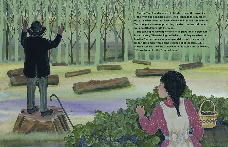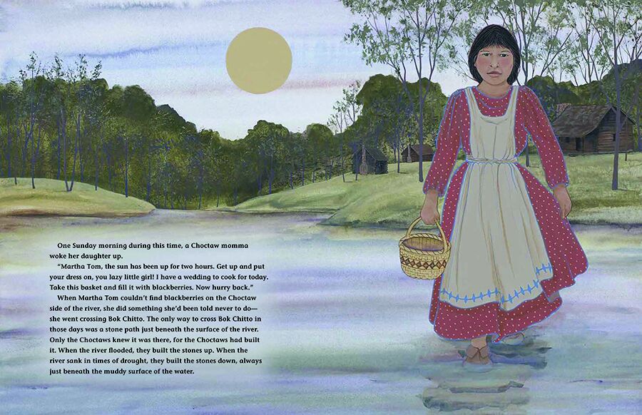 Martha Tom, a young Choctaw girl, knows better than to cross Bok Chitto, but one day–in search of blackberries–she disobeys her mother and finds herself on the other side. When a tall enslaved man discovers Martha Tom, a friendship begins between Martha Tom and the man’s family, most particularly his young son, Little Mo. Soon afterwards, Little Mo’s mother finds out that she is going to be sold. The situation seems hopeless, until Martha Tom teaches Little Mo’s family how to walk on water to their freedom.