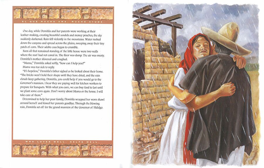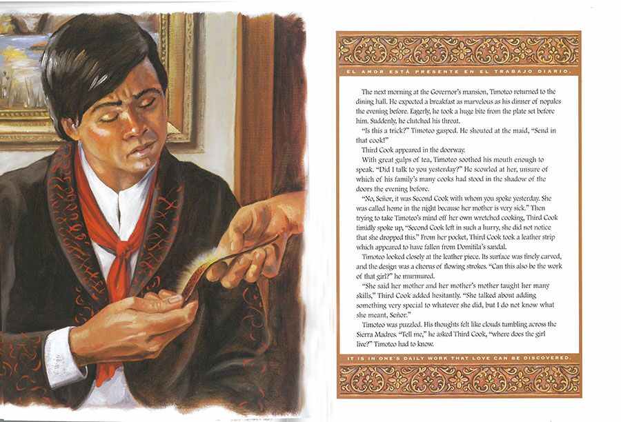 Domitila is not only “sweeter than a cactus bloom in early spring,” she is also a talented cook and an amazing leather artist. Most of the classical elements of a Cinderella story can be found in Domitila. A gentle weaving of her mother’s nurturing with strong family traditions is the secret ingredient for Domitila to rise above hardship to eventually become the Governor’s bride. Moreover, with a firm belief in simplicity and realism, Domitila makes a lasting impression as a triumphant Cinderella in her humility, service, and unassuming modesty.