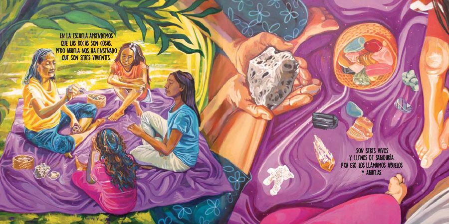 Cuando la abuela va hacia su jardín especial, sus nietas saben que deben seguirla. Abuelita invita a las niñas a explorar su colección de tesoros (rocas mágicas, cristales, conchas marinas y meteoritos) para ver qué maravillas revelan. “Son seres vivos y llenos de sabiduría,” dice la abuela. Mientras sus nietas observan con atención, los tesoros despiertan la imaginación de las niñas. Encuentran historias en la fuerza de las rocas formadas por los volcanes, el poder limpiador de hermosos cristales, el misterio del mar que albergan las conchas y cómo le dan forma al medio ambiente y el largo viaje que hicieron los meteoritos para encontrar su camino hacia la Tierra. Éste es el poder del jardín especial de la abuela, donde las maravillas crecen y florecen los cuentos.