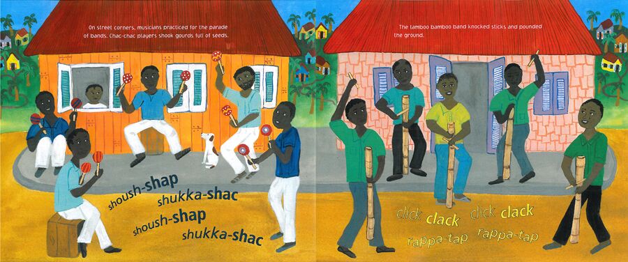 Carnival is coming, and the villagers of John John, Trinidad, are getting ready to jump up and celebrate with music, dancing, and a parade. Best of all, the Roti King has promised free rotis–tasty fried pancakes filled with chicken, herbs, and spices–for the best band in the parade.