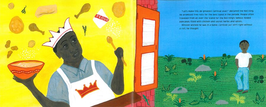 Young Winston dreams of feasting on those delicious rotis. But there’s a problem: he’s not in a band! Pondering his predicament as he wanders through the village junkyard, Winston makes a curious musical discovery that may be just the ticket to realizing his dream. With ingenuity and the help of his friends, Winston takes on the Carnival bands, drumming his way to victory–and to the Roti King’s prized treat.