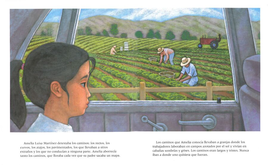 Amelia Luisa Martinez hates roads. Los caminos, the roads, take her migrant worker family to fields where they labor all day, to schools where no one knows Amelia’s name, and to bleak cabins that are not home. Amelia longs for a beautiful white house with a fine shade tree in the yard, where she can live without worrying about los caminos again. Then one day, Amelia discovers an “accidental road.” At its end she finds an amazing old tree reminiscent of the one in her dreams. Its stately sense of permanence inspires her to put her own roots down in a very special way. The richly colored illustrations bring to life the landscape of California’s Central Valley farmland. Translated from Amelia’s Road, El camino de Amelia is an inspirational tale about the importance of home.