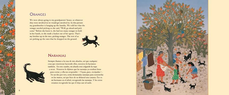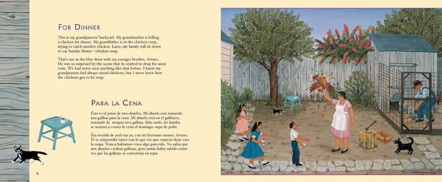 Family Pictures is the story of Carmen Lomas Garza’s girlhood in Kingsville, Texas: celebrating birthdays, making tamales, picking cactus, and confiding to her sister her dreams of becoming an artist. These day-to-day experiences are told through fifteen paintings and stories, each focusing on a different aspect of Carmen’s traditional Mexican American culture growing up.