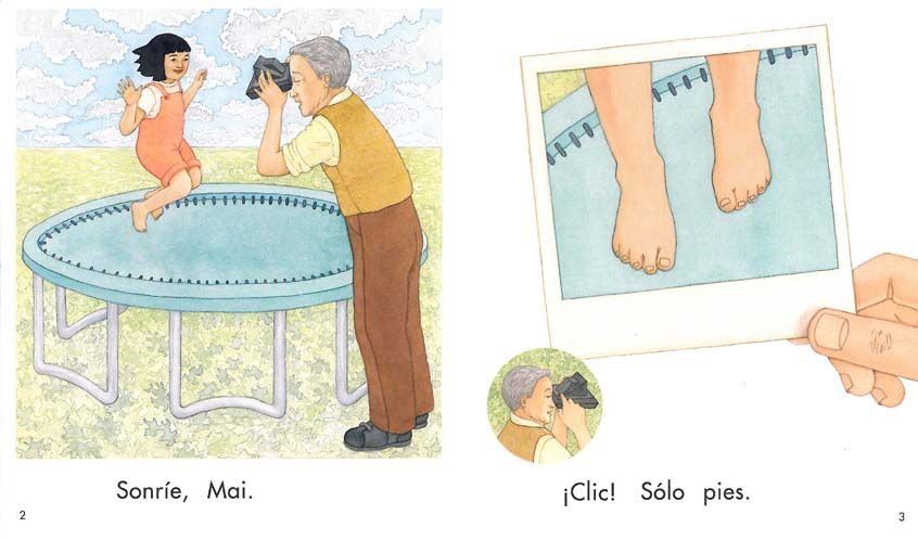 A Japanese American girl plays on a trampoline while her grandfather tries to take her picture.