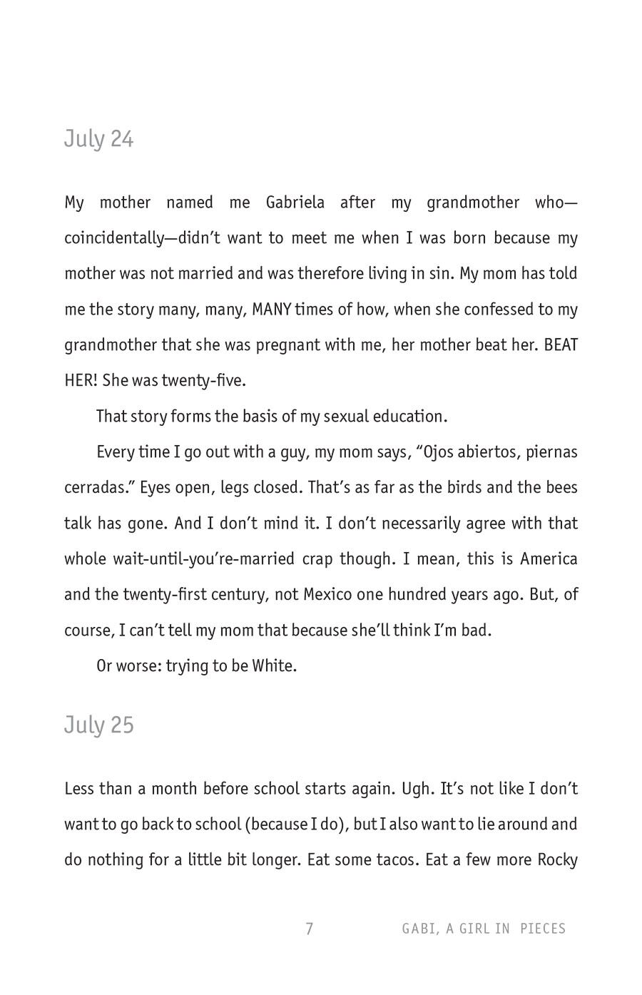 My mother named me Gabriella, after my grandmother who, coincidentally, didn’t want to meet me when I was born because my mother was unmarried, and therefore living in sin. My mom has told me the story many, many, MANY, times of how, when she confessed to my grandmother that she was pregnant with me, her mother beat her. BEAT HER! She was twenty-five. That story is the basis of my sexual education and has reiterated why it’s important to wait until you’re married to give it up. So now, every time I go out with a guy, my mom says, “Ojos abiertos, piernas cerradas.” Eyes open, legs closed. That’s as far as the birds and the bees talk has gone. And I don’t mind it. I don’t necessarily agree with that whole wait until you’re married crap, though. I mean, this is America and the 21st century; not Mexico one hundred years ago. But, of course, I can’t tell my mom that because she will think I’m bad. Or worse: trying to be White.
