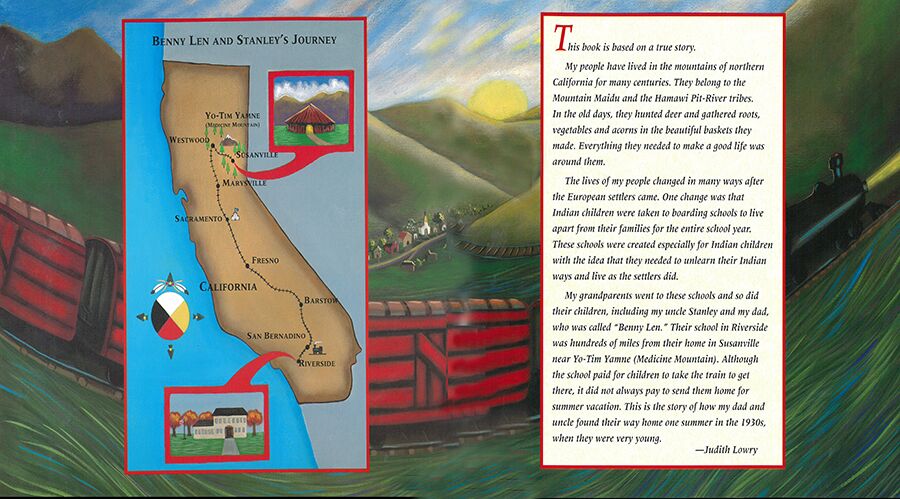 Native American artist Judith Lowry based this story on the experiences of her father and her Uncle Stanley. Judith and author Chiori Santiago tenderly relate how Stanley and Benny Len found their way home by train one summer. Inspired by their dreams of home and the memories of their grandmother’s stories, the boys embark on an adventurous journey from the harsh residential school to their triumphant welcome home at Susanville, California, in the shadow of Yo-Tim Yamne (Medicine Mountain).