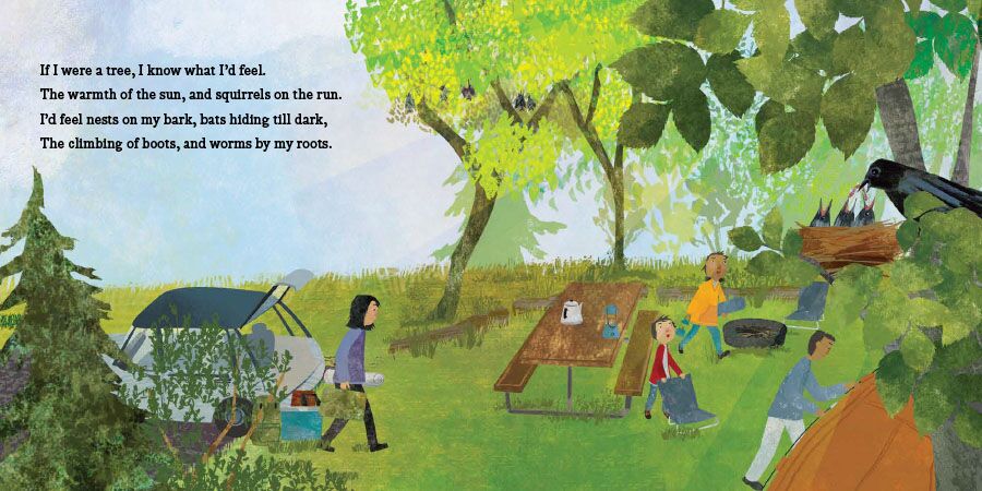 The sister has camped in the forest many times before. The brother is nervous for his first overnight trip. As the illustrations in this multifaceted picture book show the siblings discovering the woods, the text celebrates the strength and grace of the trees that surround them, through evocative verse that speaks to all five senses: