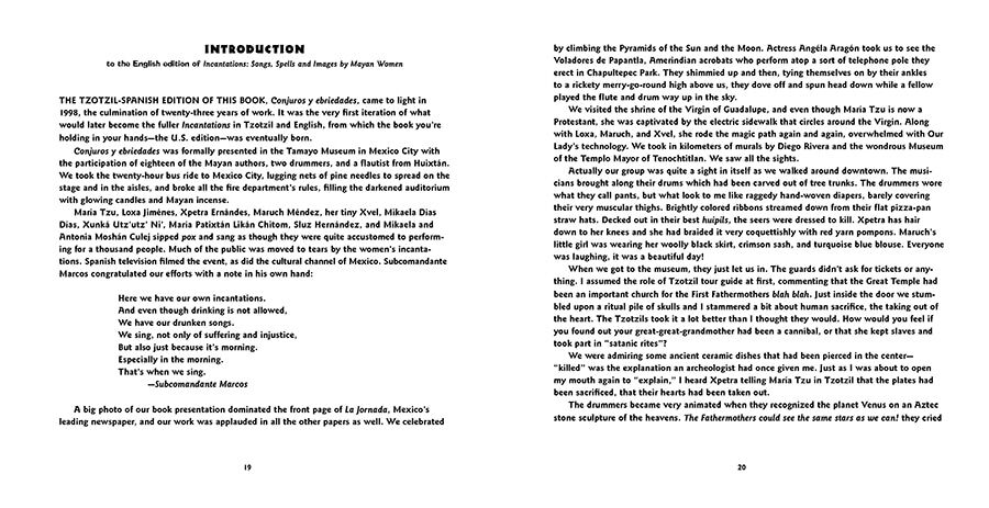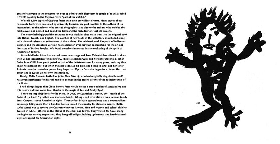 Incantations like this–poems about birth, love, hate, sex, despair, and death–coupled with primitive illustrations, provide a compelling insight into the psychology of these Mayan women poets. The Cinco Puntos edition of Incantations is a facsimile of the original handmade edition produced by the Taller Leñateros, which was covered in The New York Times.