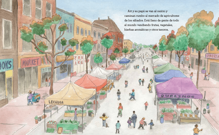 When Art’s father can’t get over a cold, Art knows exactly what his daddy needs: some delicious sick-fighting juice! After looking through the fridge and cupboards, they discover they’re missing a key ingredient–ginger. But finding some ginger will take them downtown to the farmers’ market, to the food co-op, to the West African grocery… to an unexpected encounter that brings everyone together, and results in a tasty celebration.