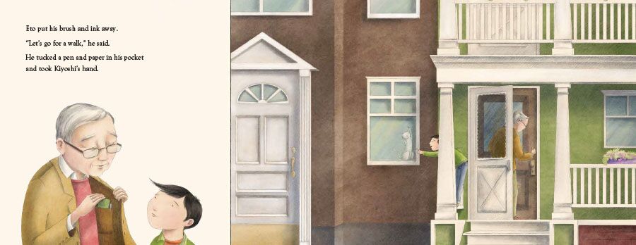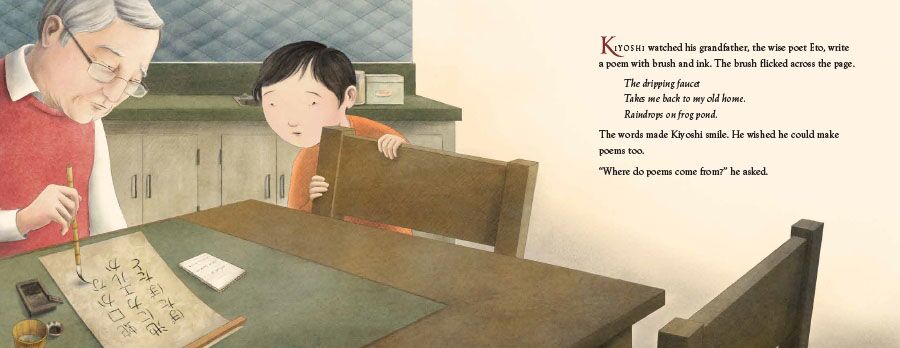 After Kiyoshi watches his grandfather, Eto, compose his delicate haiku, he wonders out loud: “Where do poems come from?” His grandfather answers by taking him on a walk through their city, where they see a cat perched on a hill of oranges; hear the fluttering of wings; imagine what’s behind a tall wall; and discuss their walk, with each incident inspiring a wonderful new haiku from Eto. As Kiyoshi discovers that poems come from the way the world outside of us meets the world within each of us, he also finds the courage to write a haiku of his own.