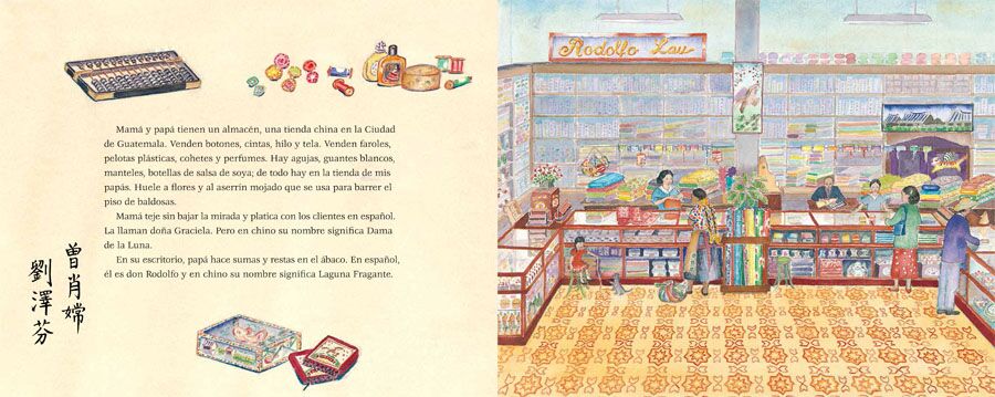 From the clip, clop of the milkman’s mule in the early morning to the clacking of her father’s abacus at night, a young girl brings us into her home, which is also her parents’ store. Located in Guatemala City, the store is filled with the colorful textures of cloth, threads, buttons, and things from her parents’ homeland in China. As people come and go throughout the day, the girl hears several languages-Spanish, Chinese, and Mayan.