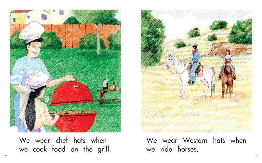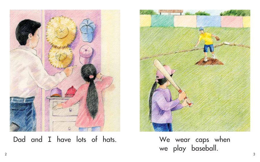 A girl and her father have lots of matching hats. This story tells what they do when they wear each won.