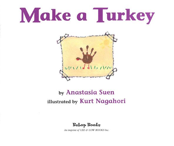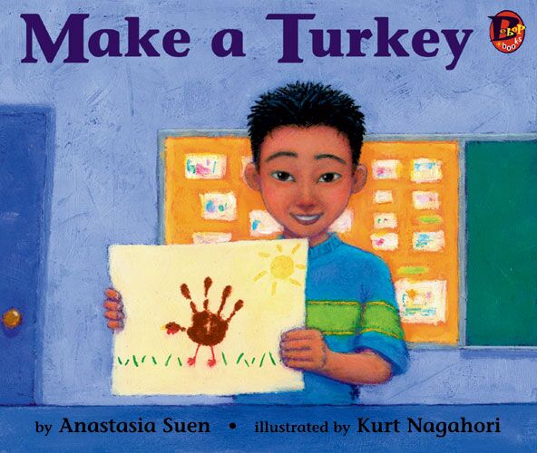 A Japanese American boy demonstrates a fun classroom project – making a picture of a turkey from a handprint.