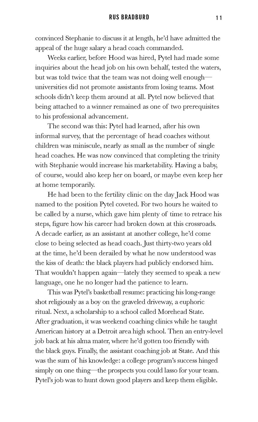 Steve Pytel is an assistant coach and top recruiter for a university basketball program. His goals are simple. He wants to keep his job and be a head coach someday. Keeping his wife barely makes the list. The team staggers; everyone’s days are numbered. Pytel was responsible for landing prized recruits Leonard Redmond and Jamal Davis. Pytel’s duties now? Keep Leonard out of jail. Make sure Jamal ignores the advice of his preacher, sidesteps his girlfriend’s pregnancy, and puts the ball in the basket. Good thing Pytel doesn’t carry around a bagful of scruples.