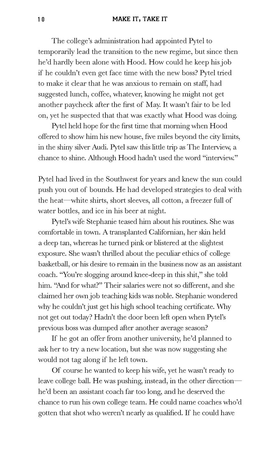 • "Make It, Take Itis a novel . . . blissfully light on the dramatic-finish game details that so often derail sports novels. Set against a backdrop of college basketball, it is a compelling story of people and the ways in which they can rise and sink to various levels."