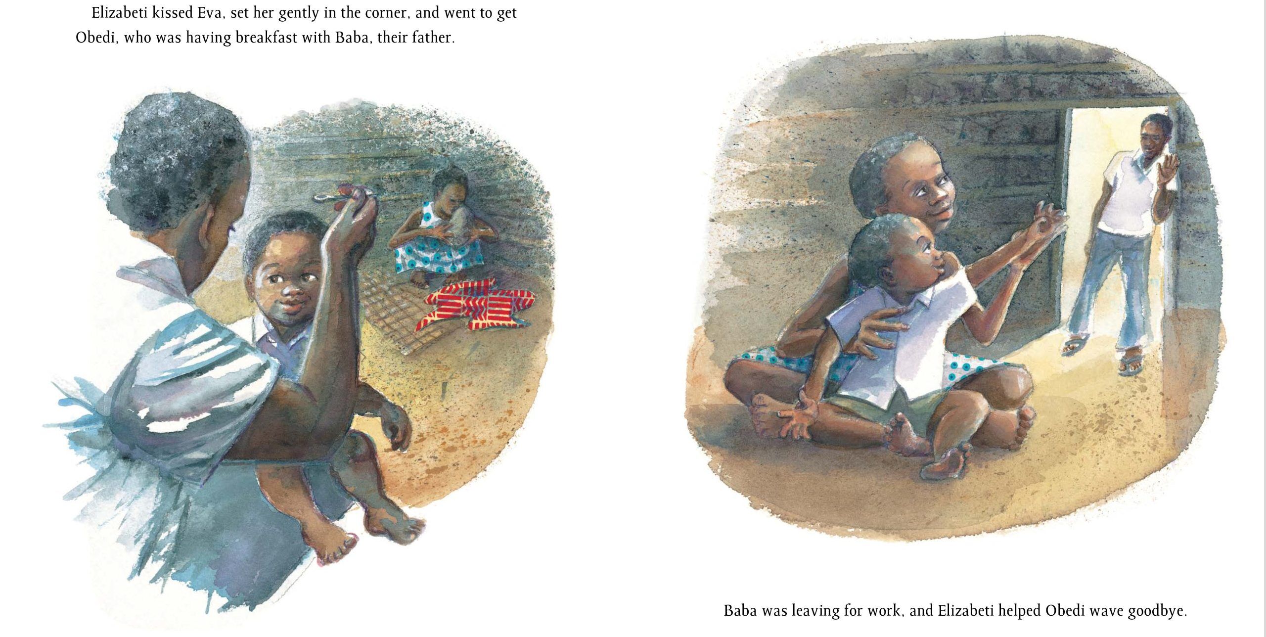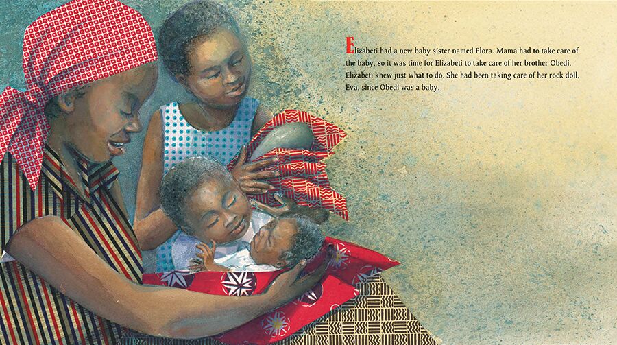 Elizabeti has a new baby sister, so now Elizabeti has to help take care of her younger brother, Obedi. Elizabeti knows just what to do. She has been taking care of her “baby,” a rock doll named Eva, since Obedi was a baby.