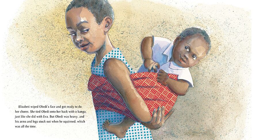 But taking care of a real child isn’t as easy as taking care of a rock doll. Elizabeti tries to sweep the floor, but Obedi pulls her hair. Elizabeti sifts rocks out of the rice, but Obedi spills it on the ground. When Elizabeti goes to get water, Obedi wiggles so much that the heavy water jug falls off her head. Poor Elizabeti. How will she get anything done?
