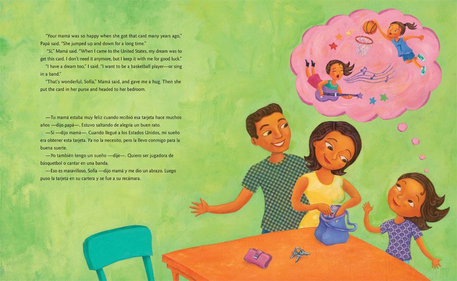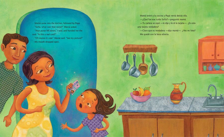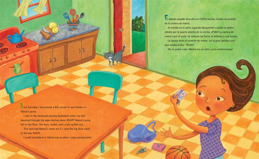When Sofia gets a peek at Mamá’s Resident Alien card, she wonders: Is Mamá an alien from outer space? Sofia heads to the library to learn about aliens. Some have four fingers on each hand, and some have blue or green skin. But to Sofia, Mamá looks like a human mother!