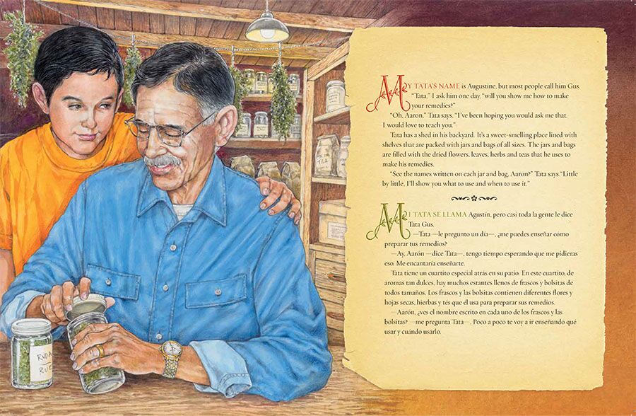 Aaron le pidió a su abuelo Tata que le enseñara sobre los remedios curativos que usa. Tata es un miembro del vecindario con antiguedad y respeto. La gente acude a él todo el tiempo por sus remedios calmantes y por su toque compasivo y su suave sabiduría. Tata sabe cómo usar hierbas, tés y plantas para ayudar a cada uno. Su esposa, la abuela Nana, también está allí, trayendo comida deliciosa y humor para ayudar a los pacientes de Tata a sanar. Al final del libro presenta un glosario con remedios herbales, que incluye información útil sobre cada planta además de dibujos botánicamente correctos.