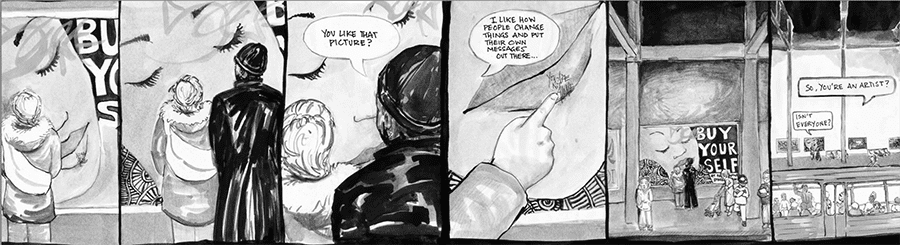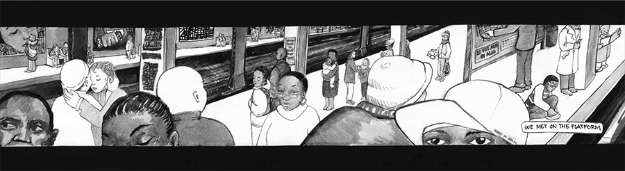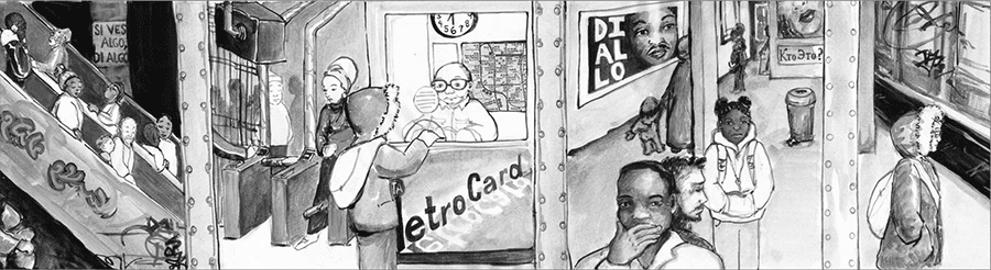 “On the subway, do you ever notice that people are always looking, but they only see what they want to?”Anthony Horton asks. A guide, an observer of the many, and resident of the spaces below New York City streets, he’s happy to show you how he lives in the tunnels underneath the subway system–that is, if you’ll let him show you. Which is exactly what happened when Youme and Anthony began a conversation in the subway about art. It turns out that both Youme and Anthony are artists. While part of Youme’s art is listening long and hard to the stories of the people she meets, part of Anthony’s job is making art out of what most people won’t even look at. Thus began a unique collaboration and conversation between two artists over a year, which culminated in this very graphic novel Pitch Black. With art and words, they map out Anthony’s life and world–a tough one from many perspectives, startling and undoing from others. But from Anthony’s point of view, it’s a life lived as art.