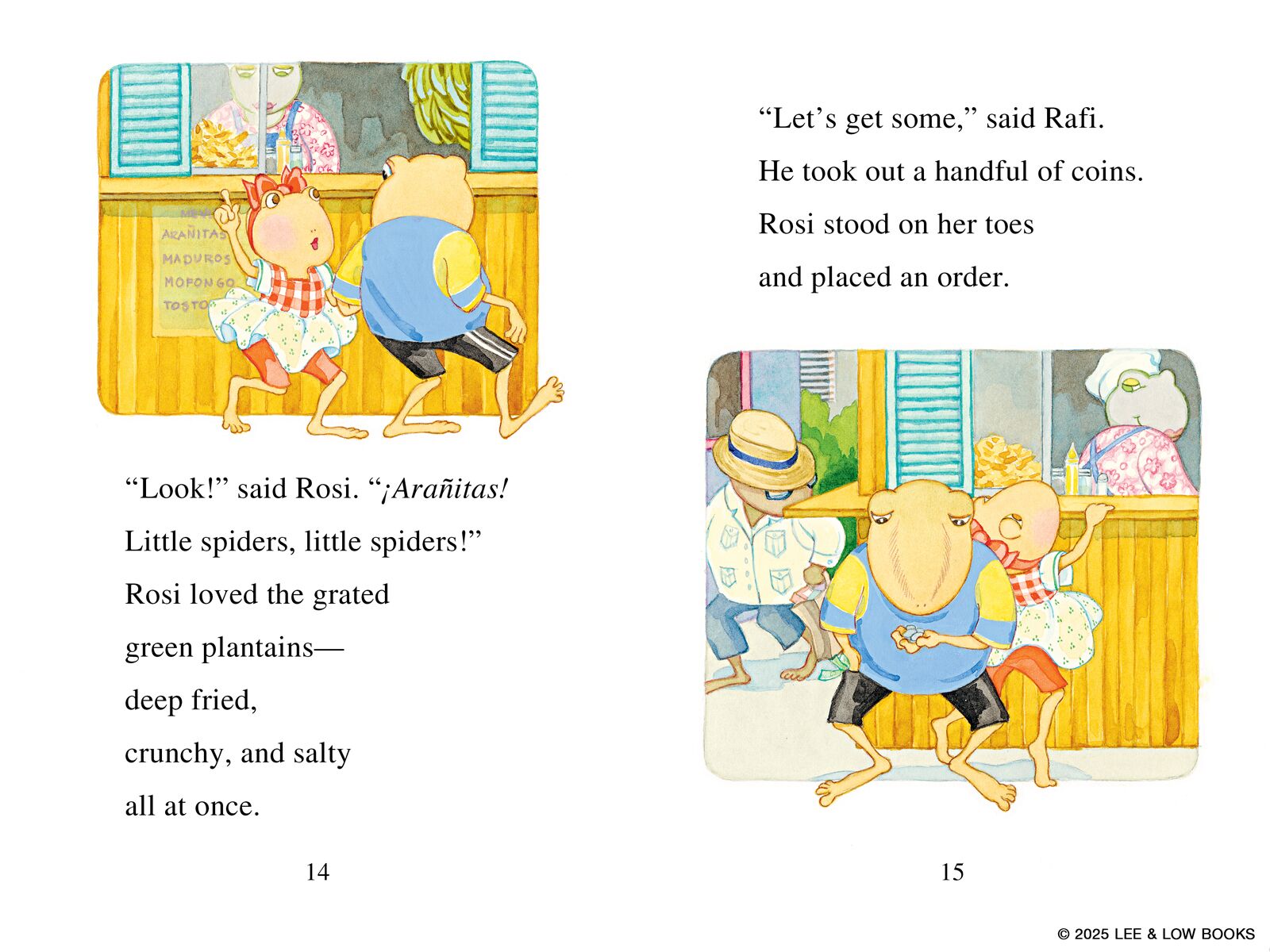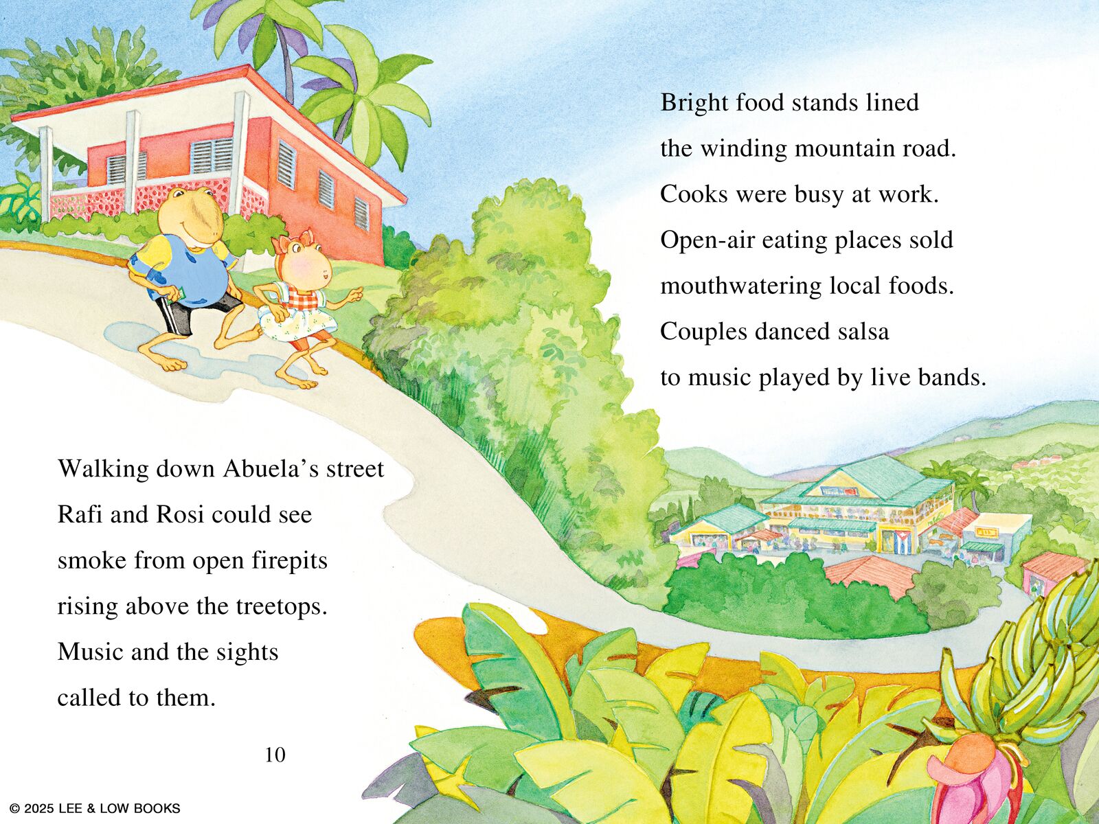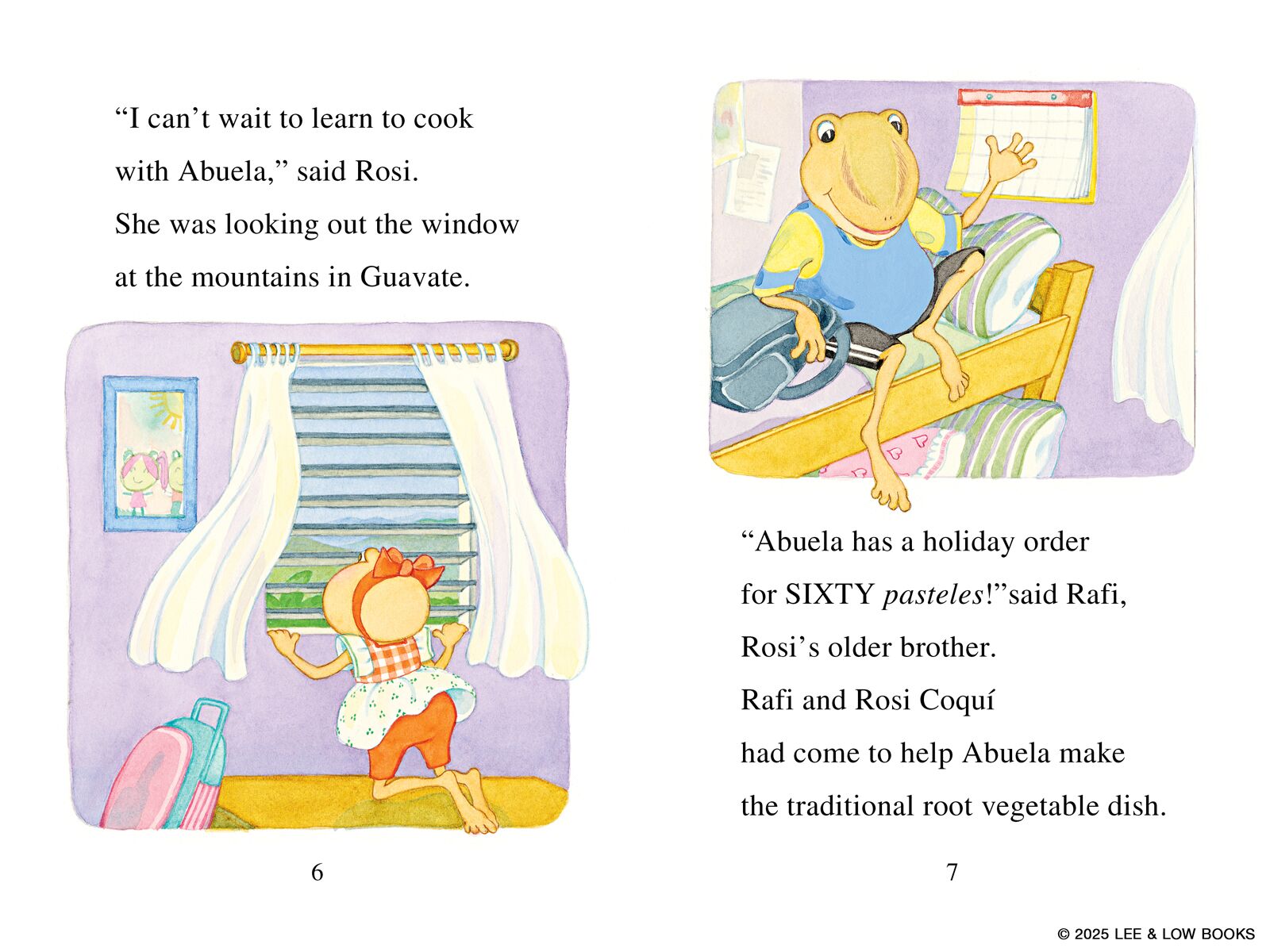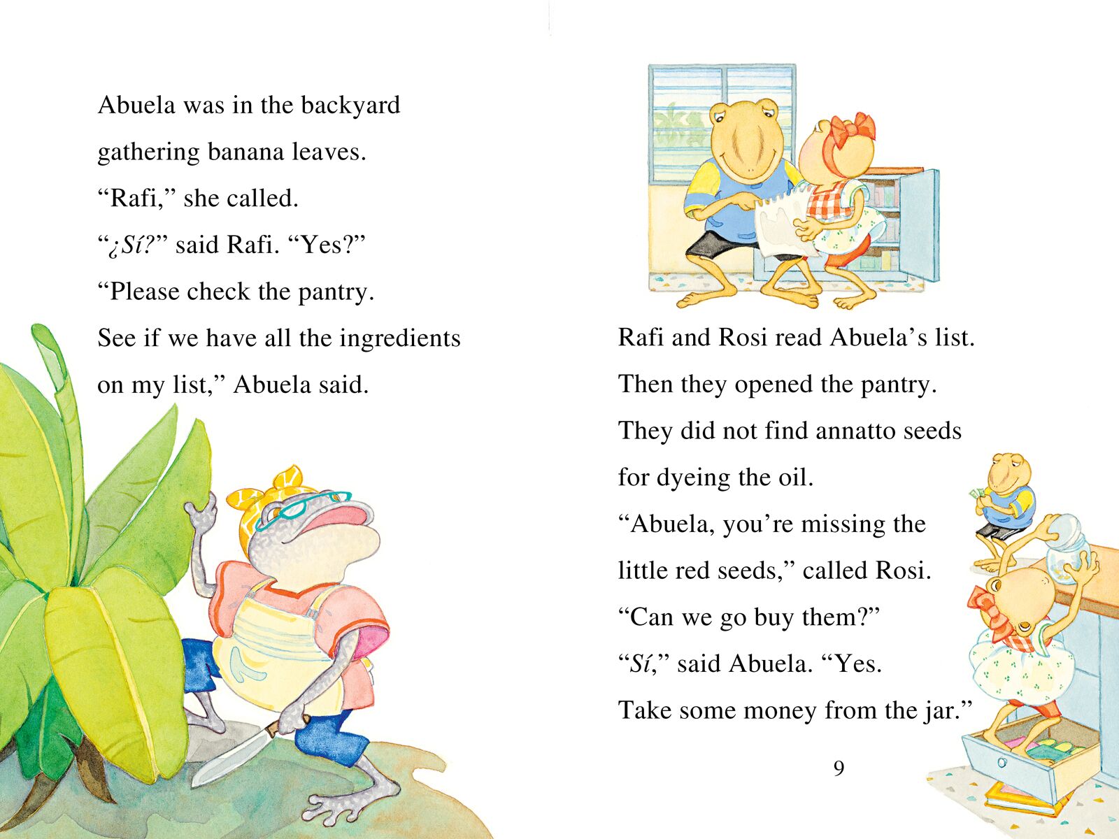 Rafi and his younger sister, Rosi, are excited to help Abuela make her holiday order for sixty pasteles, a traditional Puerto Rican root vegetable dish. When Abuela discovers she is missing one key ingredient, Rafi and Rosi set out to buy it. On the way back they get to make crunchy arañitas and at home they learn Abuela’s secret recipe for yummy guava shells in syrup. Later, when their friends can’t come to help make the pasteles, Rafi and Rosi save the day, and the best Pasteles Making Party ensues!
