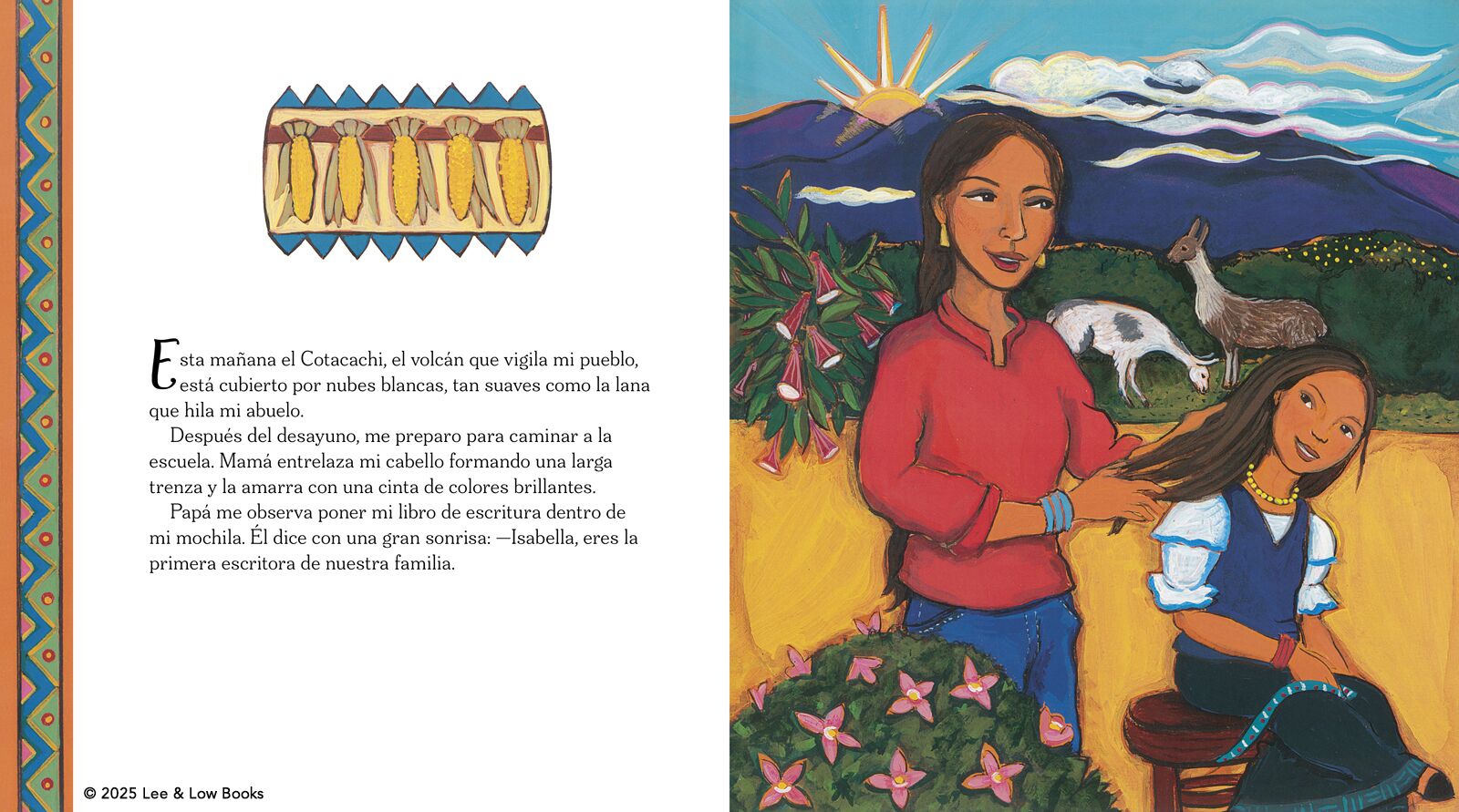Isabella loves to write, especially about the vibrant flowers her parents grow as farmworkers. When her teacher announces a school writing contest in honor of Pachamama, Mother Earth, Isabella decides to write about the rose farms where “pink, red, yellow, and orange roses grow in rows that go on forever.”