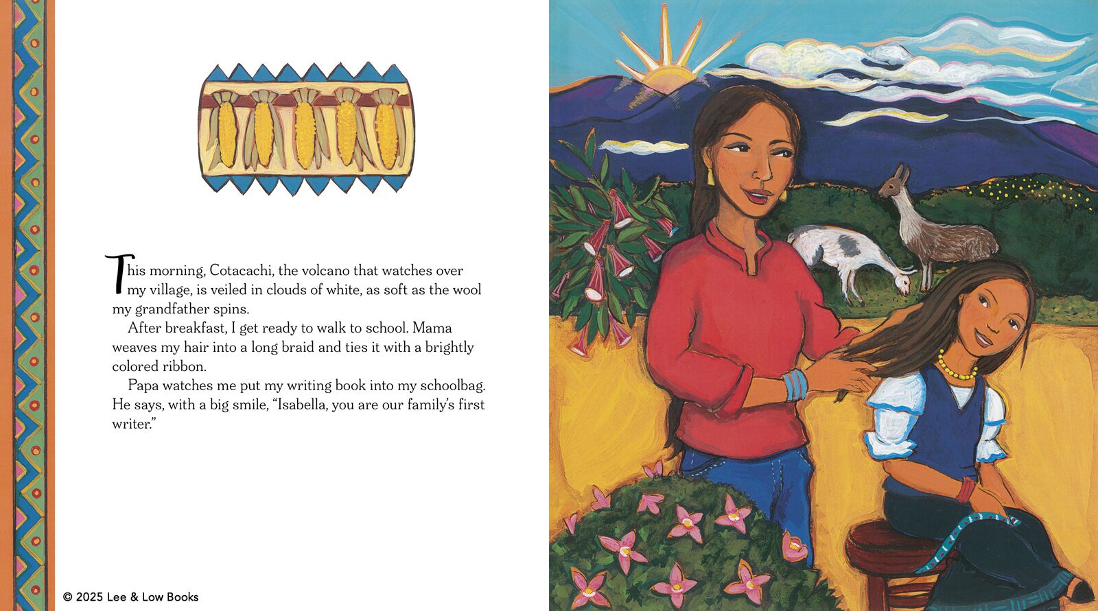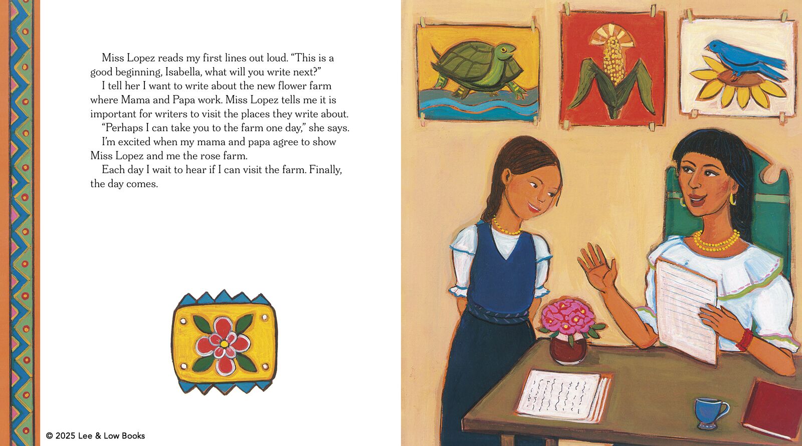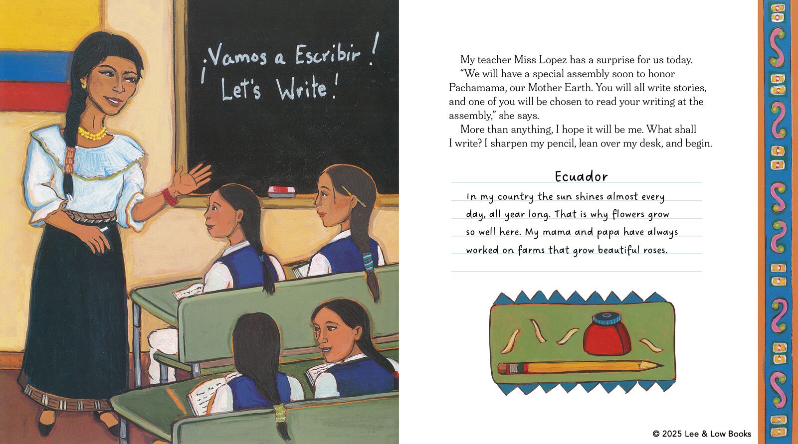 Isabella loves to write, especially about the vibrant flowers her parents grow as farmworkers. When her teacher announces a school writing contest in honor of Pachamama, Mother Earth, Isabella decides to write about the rose farms where “pink, red, yellow, and orange roses grow in rows that go on forever.”