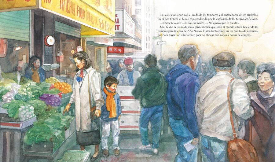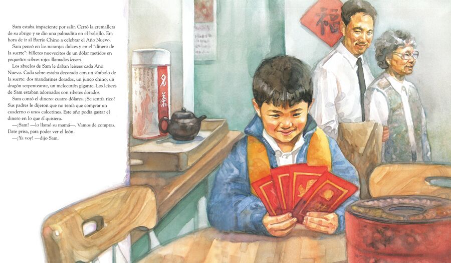 Translated from Sam and the Lucky Money, Sam y el dinero de la suerte, celebrates the sights and sounds of festive Chinatown streets. while telling the affecting story of a child who discovers that sometimes the best gifts come from the heart.