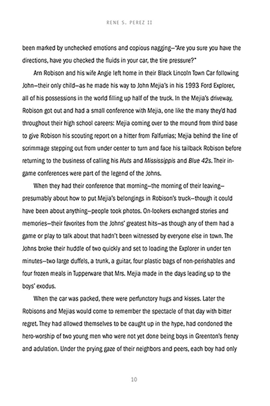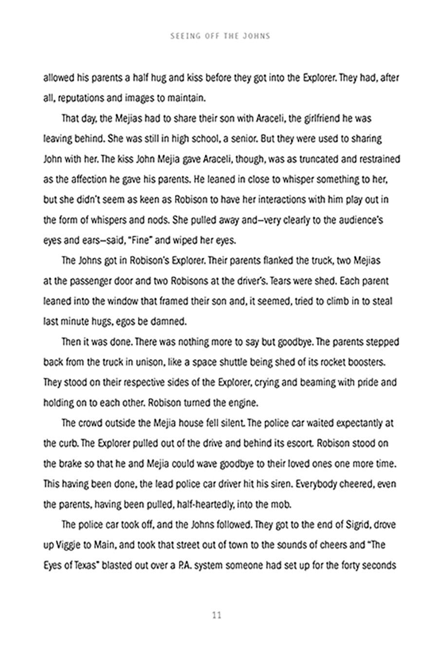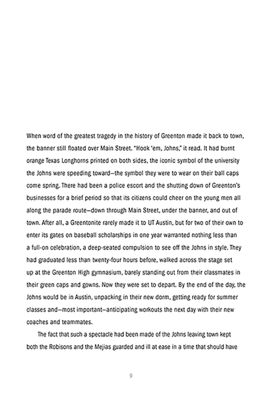 People in the small town of Greenton mark their lives from that day in late summer when crowds lined the streets to see off high school athletic stars John Robison and John Mijias. That was the day the Johns, as they were known by adoring fans in Greenton, left for state college, and never made it there–or back. The Johns had spent their high school years putting that nowhere losing town on the map with playoff runs in football and state championship bids in baseball. For Concepcion “Chon” Gonzales, the days that the Johns headed out and didn’t return was the first day of his new life. He had waited all his growing up years for a shot at Araceli when one of the Johns, John Mejia, stole her away. Now, while Greenton mourns, while the Johns’ families become actors in a spectacle of grief, while Johns memorabilia is sold in every gas station and convenience store in town, while Araceli has to endure a senior year in the watchful gaze of the whole town, Chon Gonzales makes his slow methodical move on the only girl he’s ever loved, hoping maybe that she won’t notice what he wants.