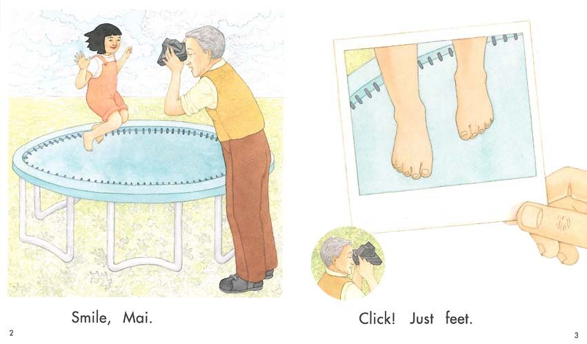 A Japanese American girl plays on a trampoline while her grandfather tries to take her picture.
