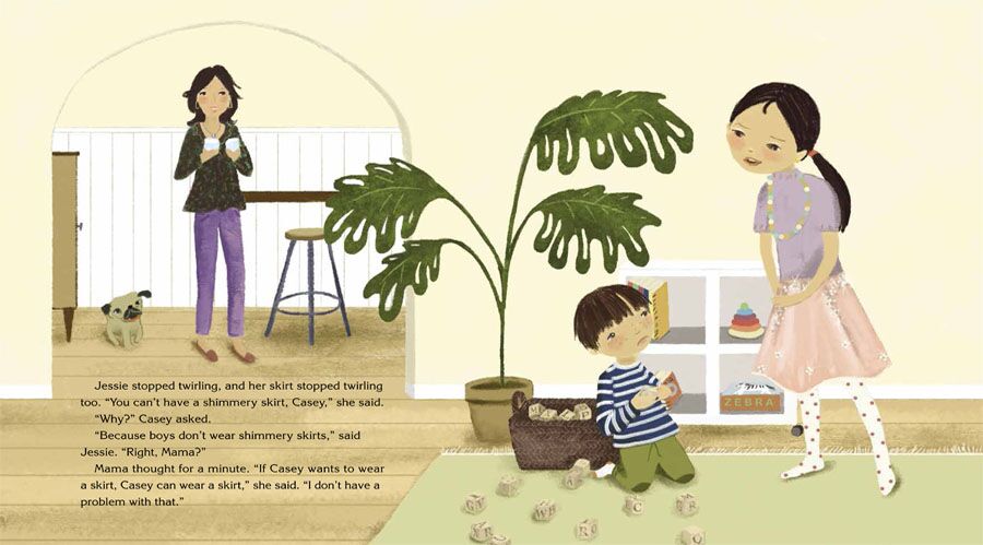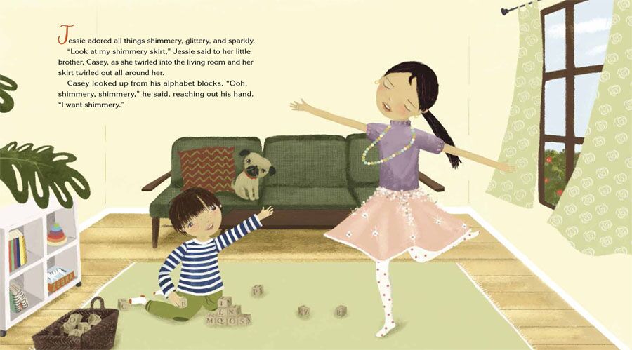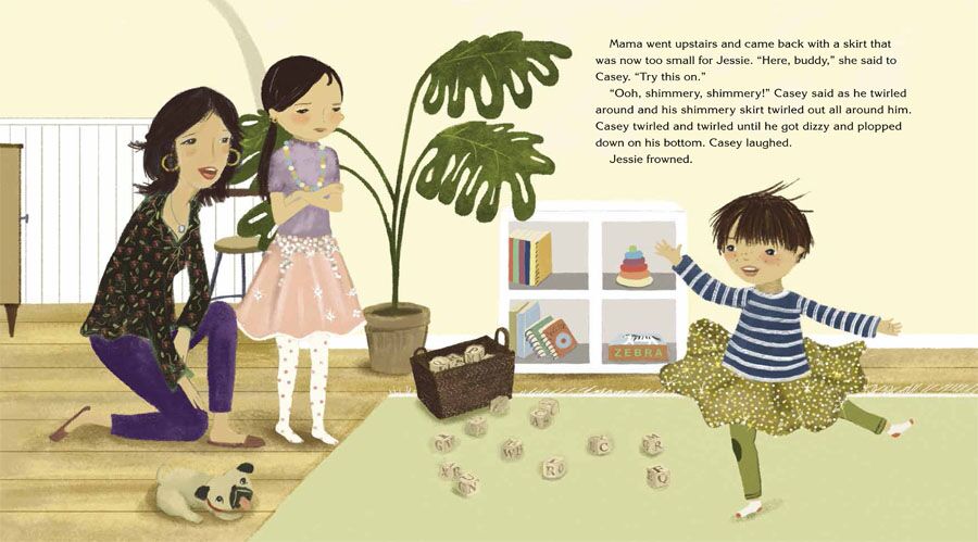 Casey loves to play with his blocks, puzzles, and dump truck, but he also loves things that sparkle, shimmer, and glitter. When his older sister, Jessie, shows off her new shimmery skirt, Casey wants to wear a shimmery skirt too. When Jessie comes home from a party with glittery nails, Casey wants glittery nails too. And when Abuelita visits wearing an armful of sparkly bracelets, Casey gets one to wear, just like Jessie. The adults in Casey’s life embrace his interests, but Jessie isn’t so sure. Boys aren’t supposed to wear sparkly, shimmery, glittery things. Then, when older boys at the library tease Casey for wearing “girl” things, Jessie realizes that Casey has the right to be himself and wear whatever he wants. Why can’t both she and Casey love all things shimmery, glittery, and sparkly?