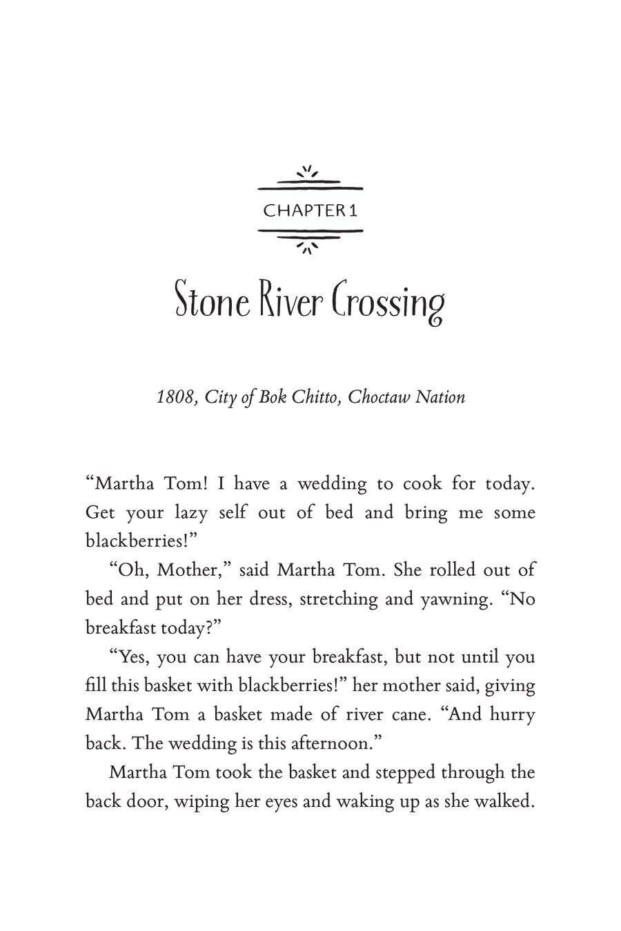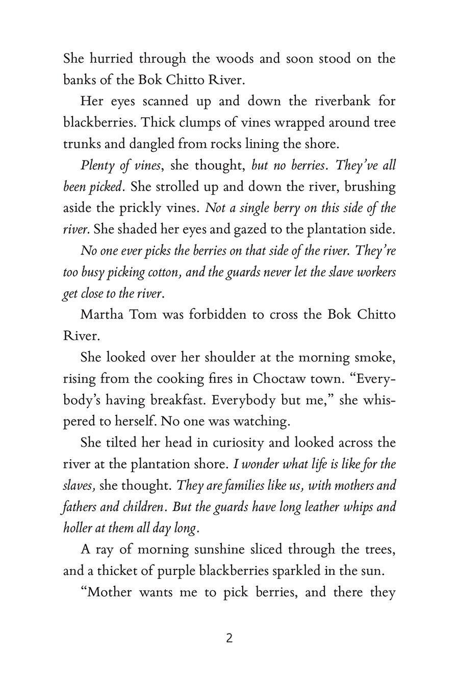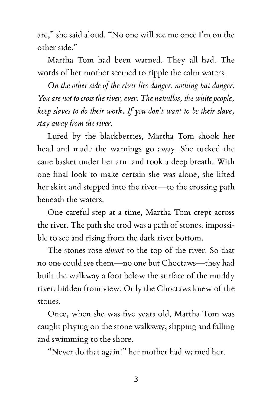 Martha Tom knows better than to cross the Bok Chitto River to pick blackberries. The Bok Chitto is the only border between her town in the Choctaw Nation and the slave-owning plantation in Mississippi territory. The slave owners could catch her, too. What was she thinking? But crossing the river brings a surprise friendship with Lil Mo, a boy who is enslaved on the other side. Then Lil Mo discovers that his mother is about to be sold and the rest of his family left behind. But Martha Tom has the answer: cross the Bok Chitto and become free.