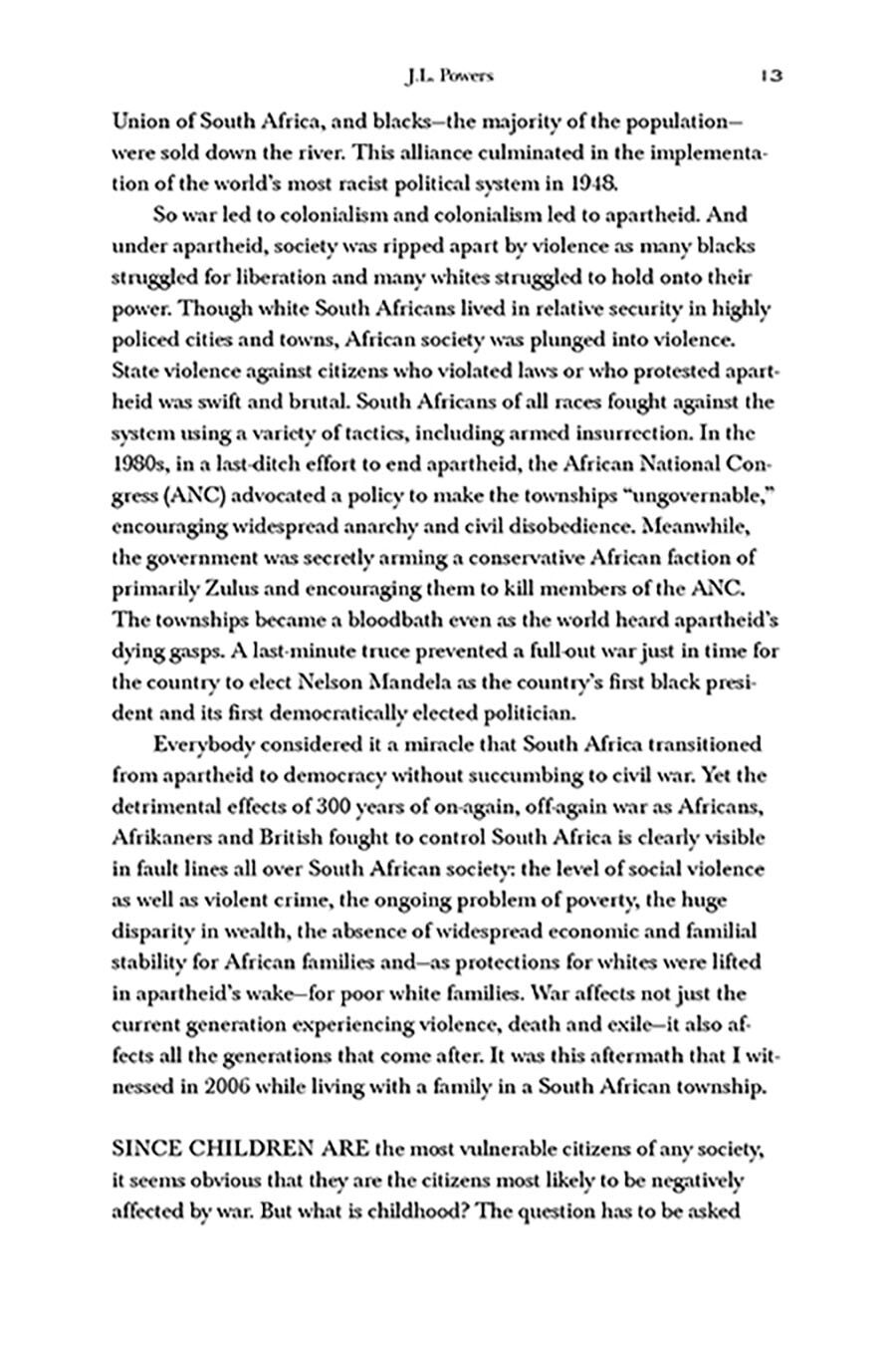 When America’s talking heads talk about war, children and teenagers are often the forgotten part of the story. Yet who can forget images of the Vietnam “baby lift,” when Amer-Asian children were flown out of Vietnam to be adopted by Americans? Who can forget the horror of learning that Iranian children were sent on suicide missions to clear landmines? Who wasn’t captivated by stories of the “lost boys” of Sudan, traveling thousands of miles alone through the desert, seeking shelter and safety? From the cartel-terrorized streets of Juárez to the bombed-out cities of Bosnia to Afghanistan under the Taliban, from Nazi-occupied Holland to the middle-class American home of a Vietnam vet, this collection of personal and narrative essays explores both the universal and particular experiences of children and teenagers who came of age during a time of war.