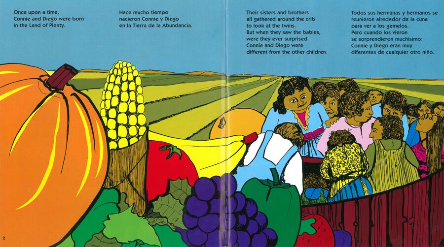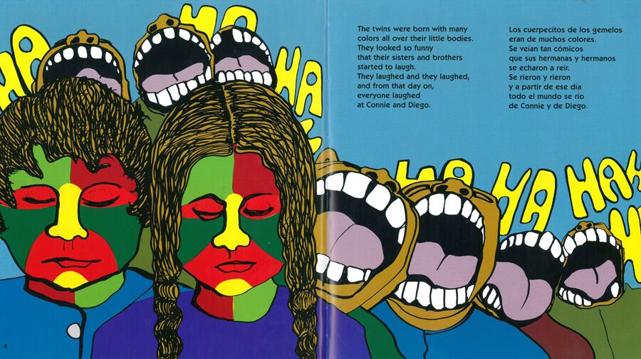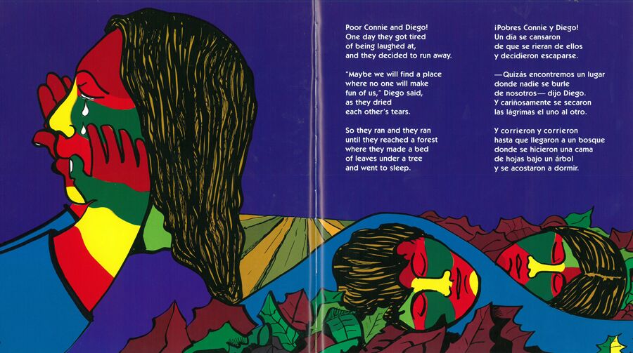 Tired of being teased because they were born with different colors all over their bodies, Connie and Diego leave the Land of Plenty. They journey through a forest and meet a big brown bear. “You can’t live with us,” growls the bear. Then they reach the ocean and beg the mother whale to take them into her family. “Impossible,” she says. A swooping eagle loves their beautiful colors and invites them to fly home with her. But alas, they cannot fly. Finally, the tired children stumble through a scary jungle where a wise tiger helps them understand that their home is with human beings.
