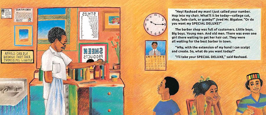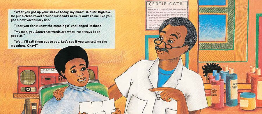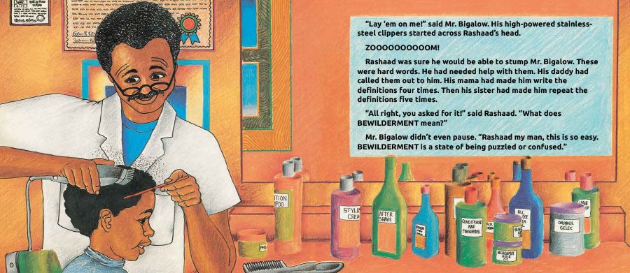 Rashaad gets his hair cut by the best barber in town. Mr. Bigalow is his name and words are his game–and that’s what his cutting edge is all about! As Mr. Bigalow gives Rashaad a SPECIAL DELUXE haircut, Rashaad tries to stump him with words from his latest vocabulary list. But clever Mr. Bigalow always has the right answer. When Rashaad gets curious about Mr. Bigalow’s methods, he discovers the secret to the barber’s success.