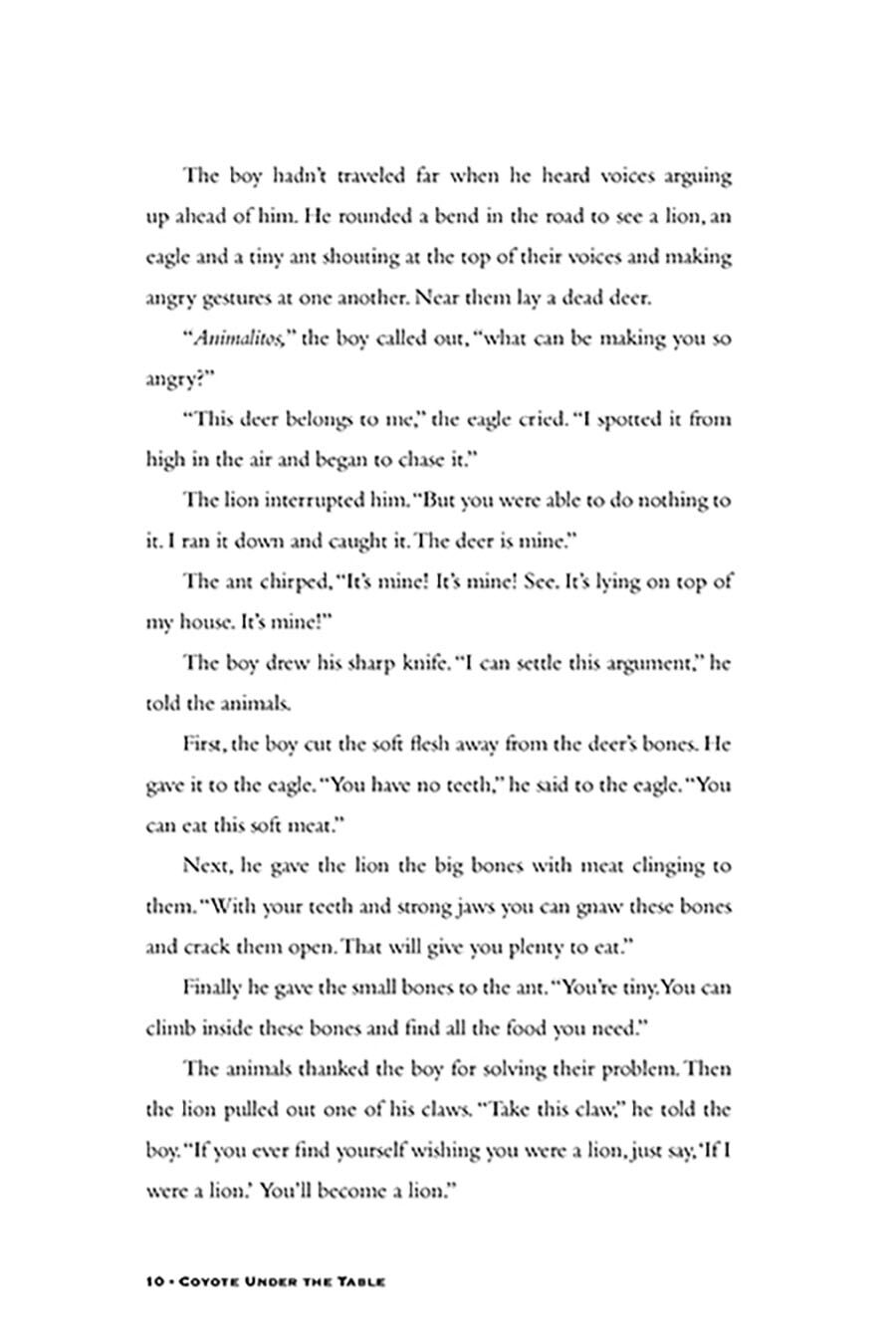 Pero eso no es nada comparado con algunos de los otros cuentos populares salvajes y maravillosos reunidos por el autor Joe Hayes en esta edición bilingüe de El coyote debajo de la mesa. Al igual que su colección exclusiva El día que nevó tortillas, este libro está lleno de personajes animados e historias que hacen reír a carcajadas. Hay un trío de pretendientes inadecuados que cortejan a una joven inteligente y terminan asustados una medianoche en una iglesia embrujada. Y un hombre codicioso que aprende una lección el día que no puede parar de bailar. Y un gato manchado, ¡que en realidad es un ángel guardián disfrazado!