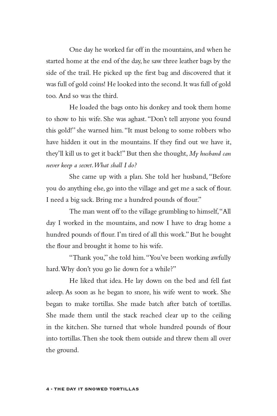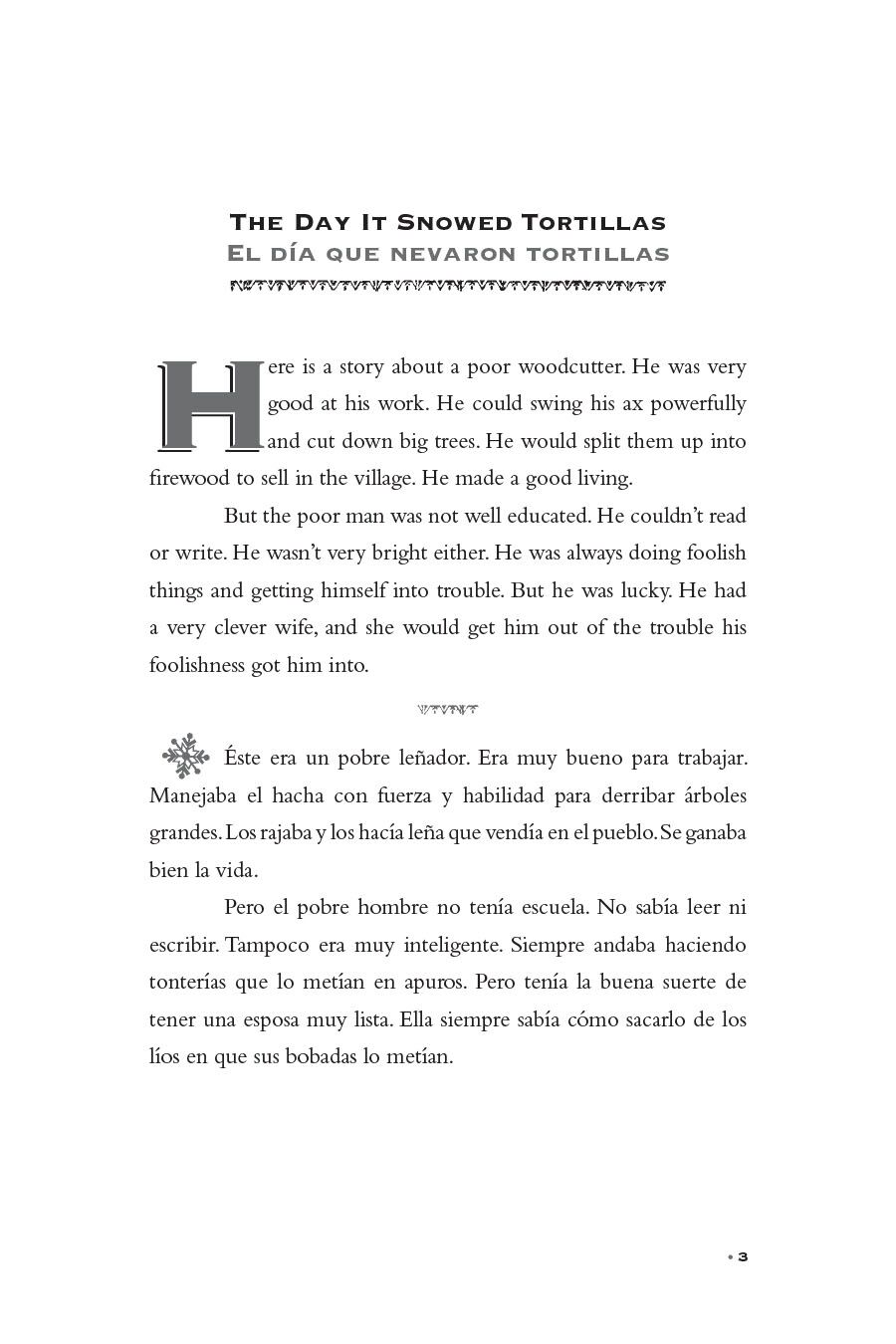 Los cuentos de esta colección han sido compartidos durante más de cuatrocientos años, desde que los españoles llegaron a Nuevo México. En manos del ingenioso Joe Hayes, es especialmente fácil ver la magia que ha mantenido vivas estas historias generación tras generación. En la historia principal, una mujer muy inteligente salva a su marido despistado de una banda de ladrones, ¡al hacerle creer al anciano que nevaron tortillas durante la noche! El encantamiento continúa historia tras historia: un astuto ladrón engaña a un rey para quedarse con su reino y un príncipe encuentra a su amada en una casa llena de malvadas hermanastras. Y por supuesto, escuchamos el antiguo cuento de La Llorona que aún busca a sus hijos ahogados por las orillas del río.